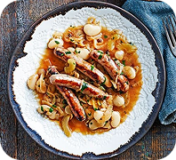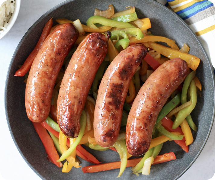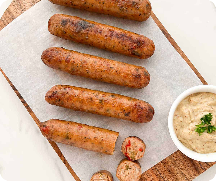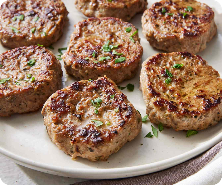 Mildly seasoned pork sausages, popular in British & American breakfasts, known for their juicy texture.