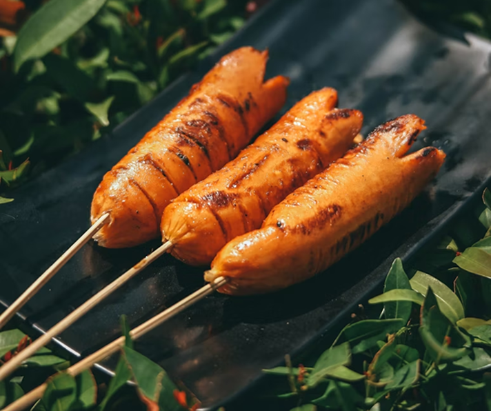 Made from spiced, boiled, and grilled meat mixed with blood and stuffed into intestines, commonly enjoyed as a street food delicacy.